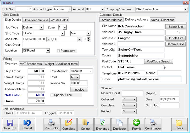 Using the graphics based scheduler bookings and skips can be managed effectively. The software allows you to simply move jobs by date or driver without the need to create new records. Users can then print off individual job records and daily driver schedules or, to fully automate your operation there is an android phone app that allows drivers to receive their schedules and job details straight to their phone or tablet, your drivers can then capture customers signatures and take photographs associated with each job, completed jobs are sent back to the main system in the office complete with signed POD’s ready for invoicing, in a totally paperless process.
